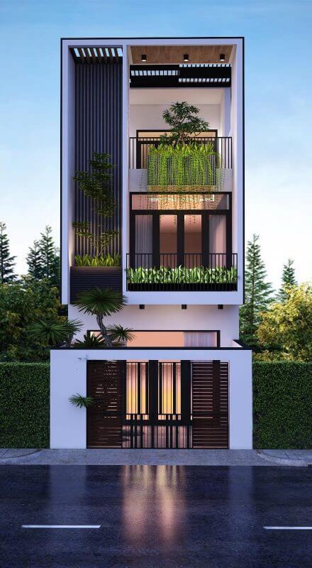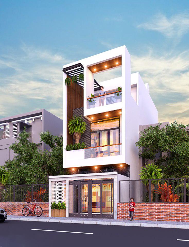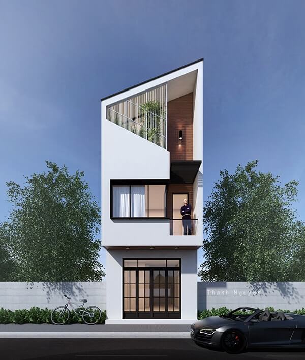 Sơn nhà màu trắng làm màu chủ đạo kết hợp với màu xám đen tạo cho ngôi nhà phố sự hài hòa đầy ấn tượng. Thiết kế theo phong cách hiện đại. Ngôi nhà thể hiện tính thẩm mỹ qua việc tạo hình kiến trúc với các đường nét cấu tạo vuông vức, lồi lõm hợp lý.